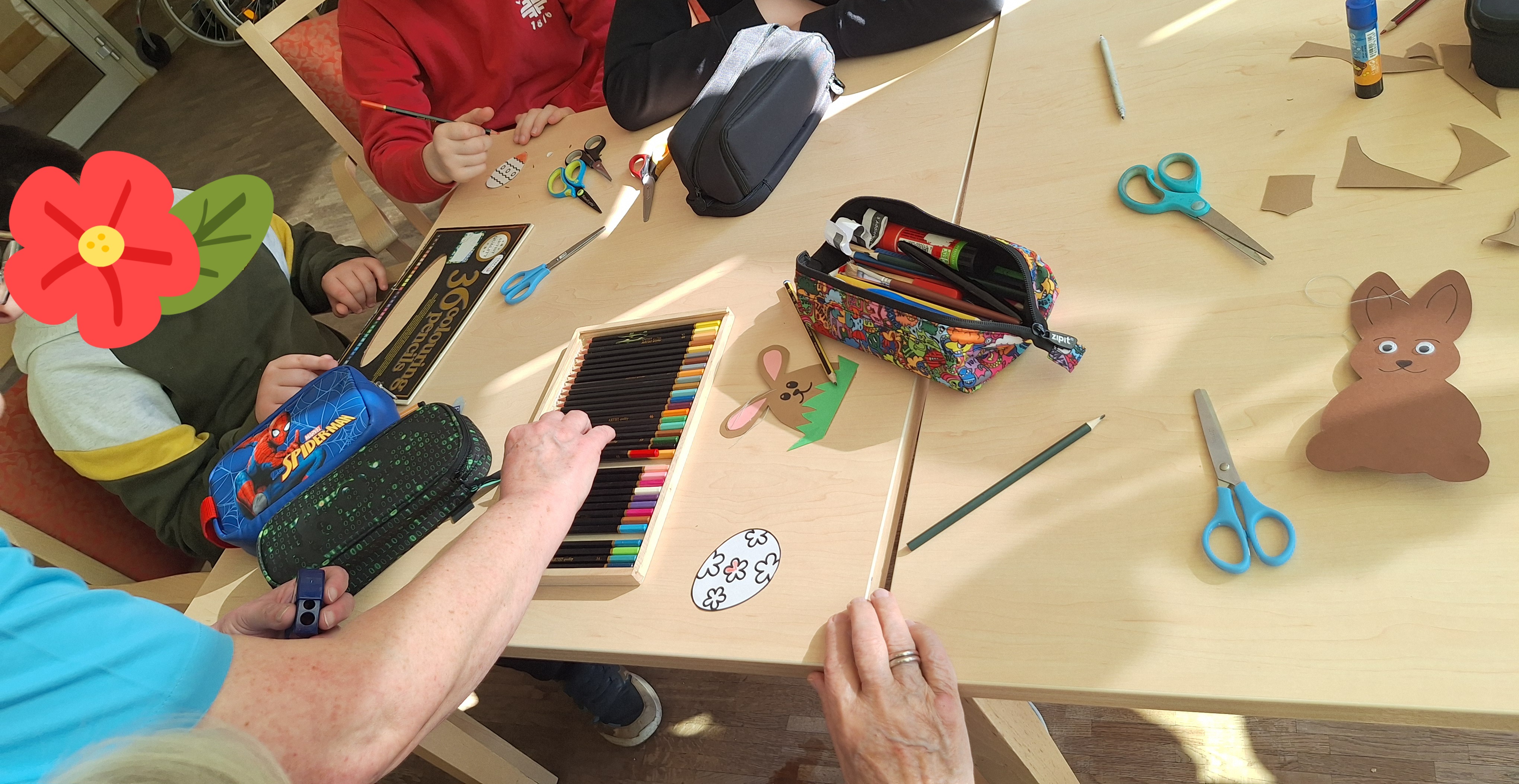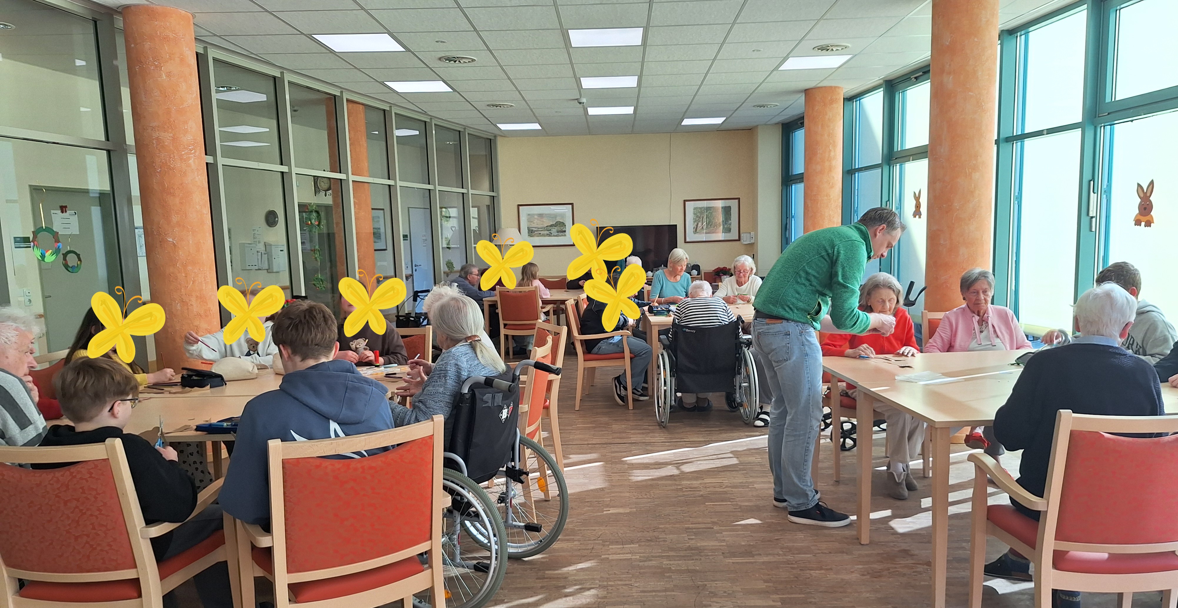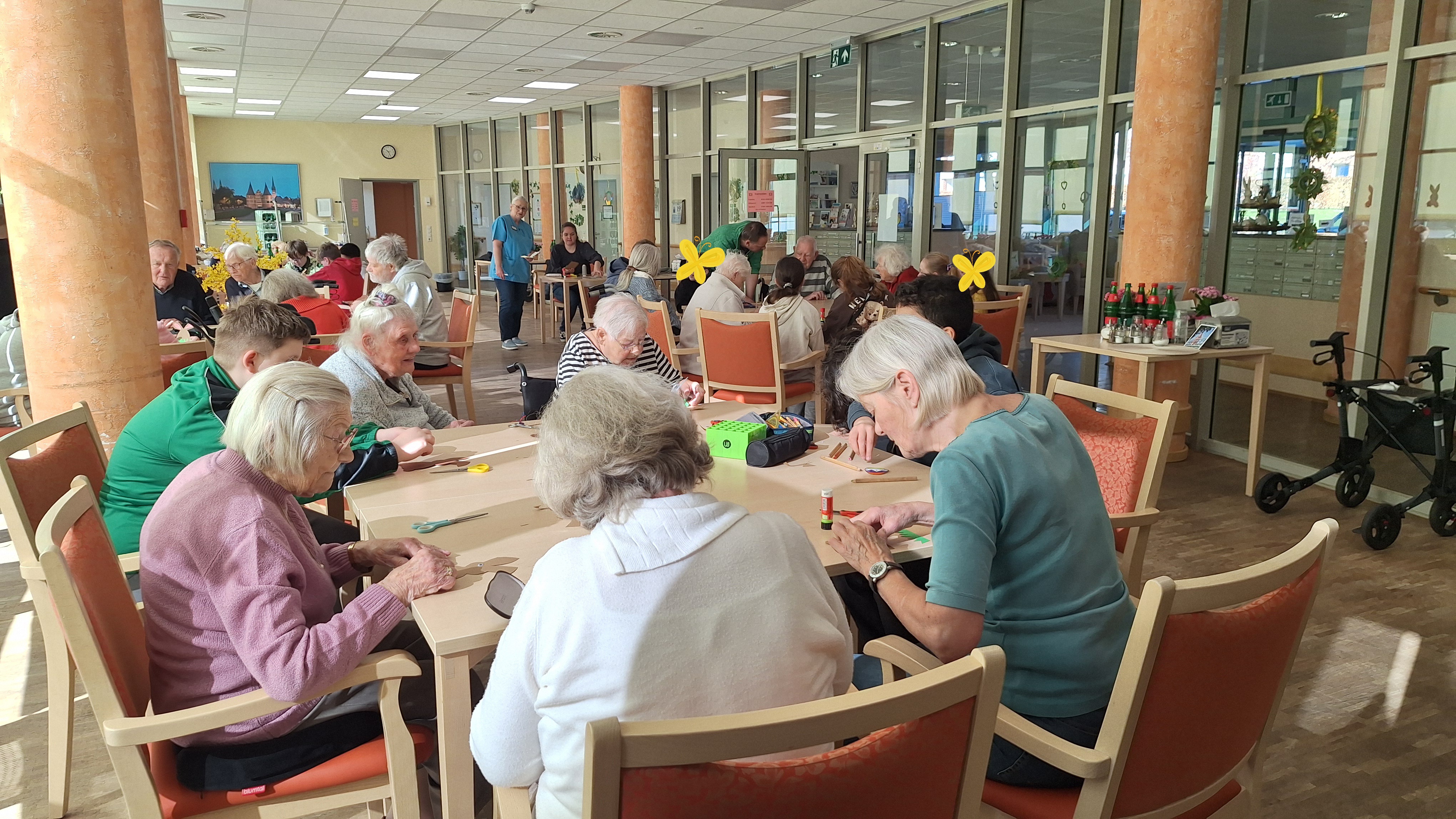 Gemeinsam mit den Bewohnerinnen und Bewohnern bastelten die Kinder frühlingshafte Osterdekoration für die Einrichtung. Für viele der Seniorinnen und Senioren stellte dies eine besondere Herausforderung dar, da einige von ihnen in ihrer Sehfähigkeit eingeschränkt sind oder Schwierigkeiten im Umgang mit Schere und Bastelmaterialien haben. Mit viel Geduld und Einfühlungsvermögen unterstützten die Schülerinnen und Schüler die älteren Menschen, sodass zahlreiche schöne Dekorationsstücke entstanden.