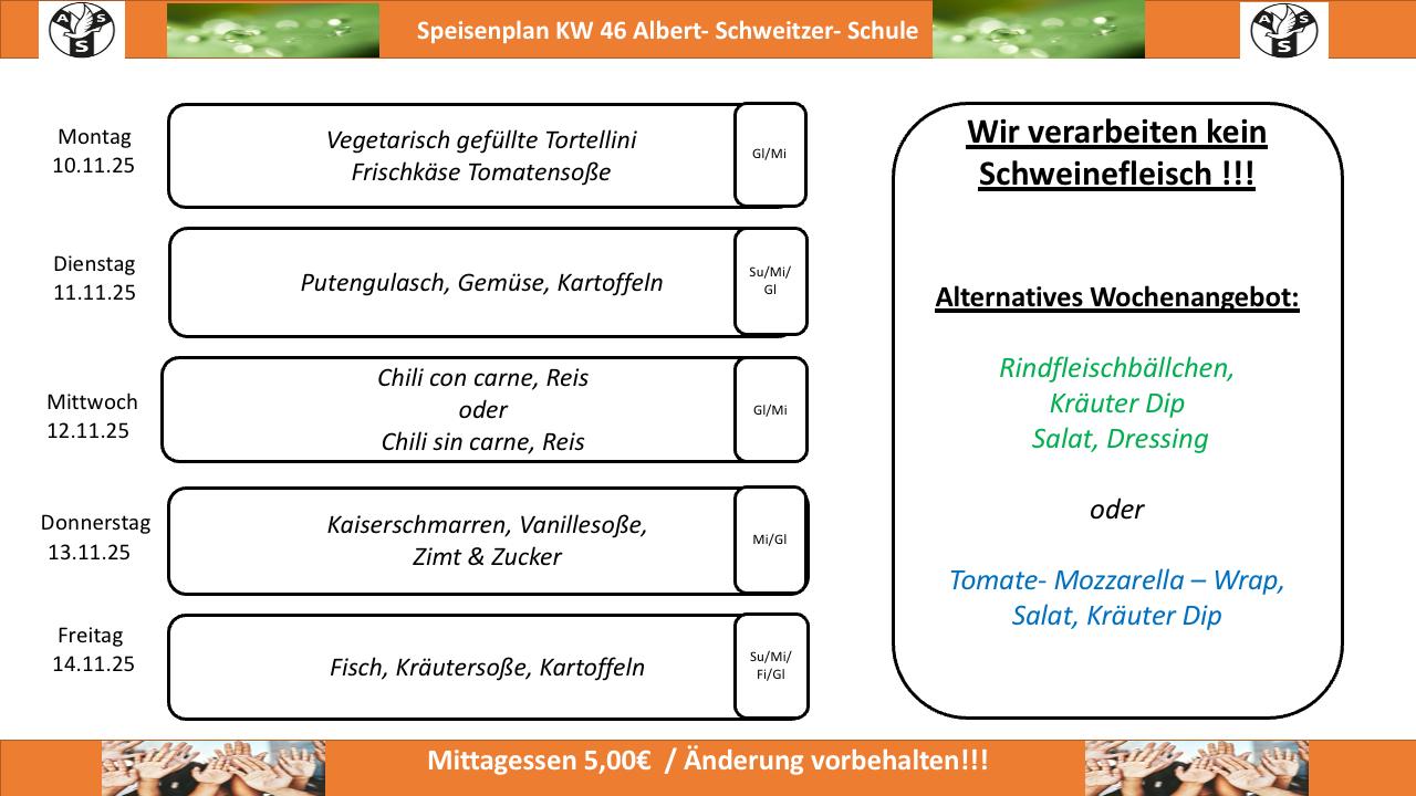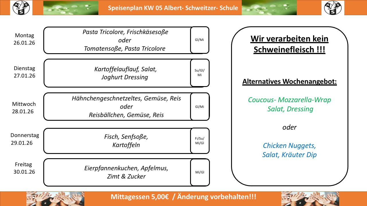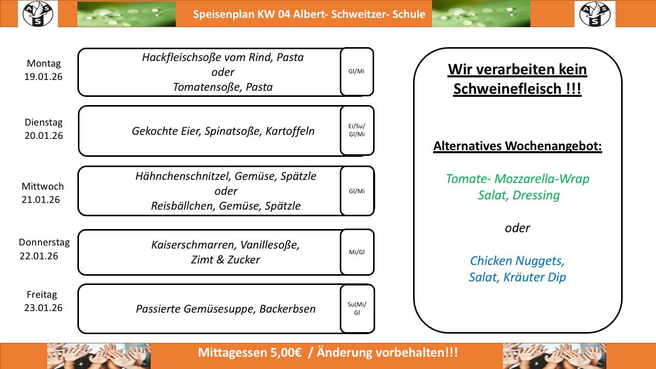 Seit dem 01.11.2022 können wir dank des neuen Mensabetreibers und Kochs Sven Larsen nun allen Schülerinnen und Schülern der Albert-Schweitzer-Schule ein Mittagessen anbieten. Das Angebot kann dabei "spontan" in Anspruch genommen werden oder ganz regelmäßig.
